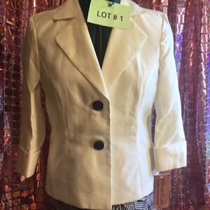 Jacket is cream color with black front closure buttons & 3/4 length sleeve cuff buttons to match, shoulders are slightly padded, jacket is lined
