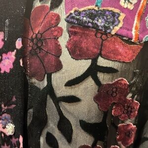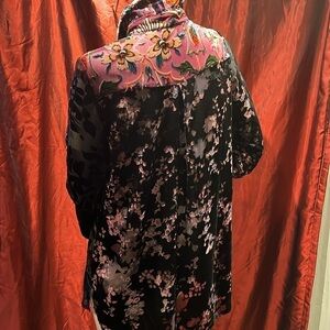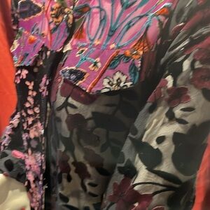 Very unique, one of a kind, button-down, medium, adore, sheer, fabric, polyester, eggplant, purple, lavender, purple, lace, dressy, shabby cheek, blouse, definitely a rarity you’ll find so many compliments coming your way if you wear this, you can wear it anywhere you can dress it up although it’s sheer and see-through, you don’t need to wear a blouse underneath it’s the perfect hint of peekaboo. Patterned