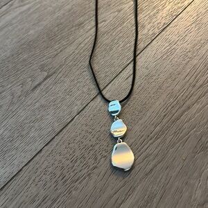 Elegant necklace with a black cord and silver pendant. Perfect for any occasion.