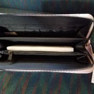 The wallet zips up, inside coin zipper in the middle and pockets for cards on both sides. The wallet is pink with different color flowers. excellent condition.