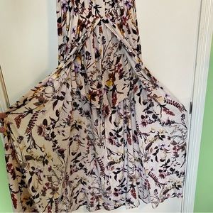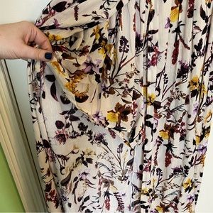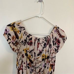Hard to describe this style. Its a slinky, slippery material, with romper shorts underneath, but loose panels on the legs that look like pants, or a maxi dress. Very pretty floral print with small puff sleeves.