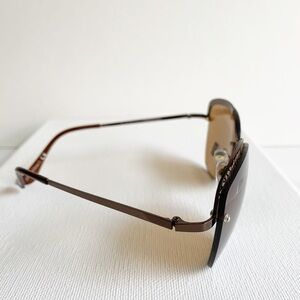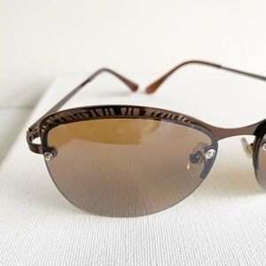 Semi rimless brown lens wire sunglasses. Gold accents and brown ear pieces.