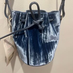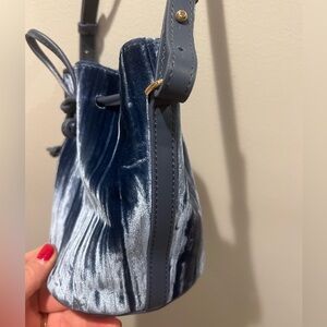 Micro Farrow velour bucket bag with leather strap, strap is adjustable. Approximate size of bag is 8 x 7 x 5 deep. Strap length 23 inches. Does not have original duster but can send one. Cute size for going out- roomier than you think!