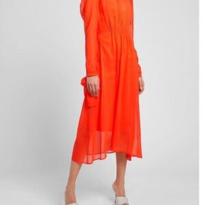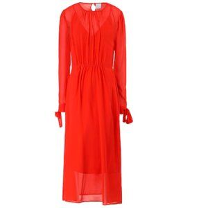 An elegant midi dress in pure silk chiffon, in a solid-color design with matching genuine silk slip. It boasts a subtly fitted waist, round neckline, long sleeves, side zipper closure and tone-on-tone ribbons to tie at the cuffs. More colors available. Model is 5'10"/178 cm tall and wears an Italian size S-40