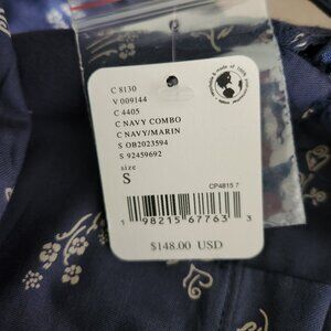 Beasley Mini Dress. Fully lined. Drop waist, collared neckline, and a keyhole cutout at the back. A-line and has a shift style. Buttons down the front of dress. Zipper closure in the back with hook and eye, goes up to about the waist. Open back with button closure at the top. Cap sleeve. Lace detailing. Color Navy with gray flowers and hearts print. 2 extra buttons with tag.