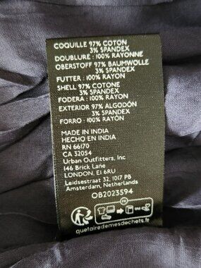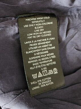 97% Cotton 3% Spandex. Lining 100% rayon. Machine wash cold separately, line dry, low iron as needed. May be dry cleaned. Made in India.