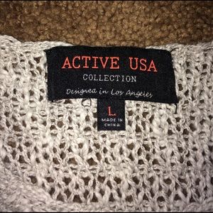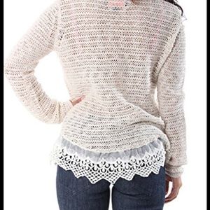Super dainty & comfy- Soft open weave light gray sweater, with lace trim. Front is slightly higher than back. Please note: Size large. This is not a looser large, that just hangs, it shapes your chest. Recommend a camisole under it.