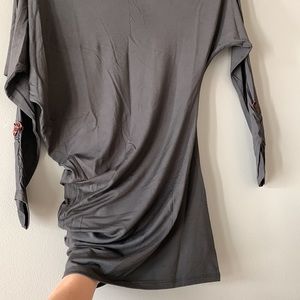 Brown asymmetrical batwing top. Bows and ruched detail on sleeves. See second photo to see how the body of the shirt fits.