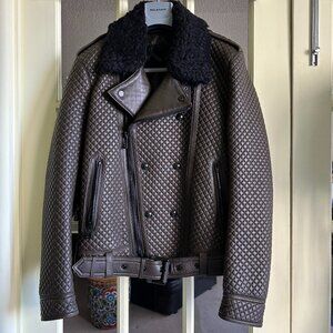 FEATURES: Biker jacket silhouette. Luxuriously crafted in Italy from genuine quilted sheepskin, in a dark greenish brown, with detachable dyed shearling collar. Asymmetric zip front with snap closure. Belted collar. Shoulder epaulets. Two front zip pockets. One interior pocket with snap closure. Belted waist. Sits at or slightly below the waist. Slightly longer sleeves with zip placket and snap cuffs. Signature detail on all metal zipper pulls, snap buttons and belt buckle. Tonal stitching. Includes original Belstaff hanger.