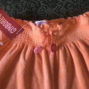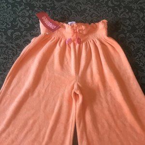 orange terri cloth wide leg crop pants with flower tassle accent at the waist