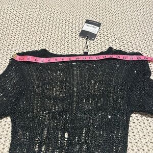This maxi dress has a sheer loose knit construction, a distressed look, a sequin finish, long sleeves