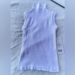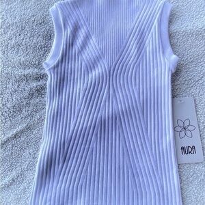 Beautiful top but small I didn’t want to stretch out on mannequin and didn’t photograph well. Pure bright white and brand is tops. Aura has stretch says s/m for size pit to pit 12” length 19”