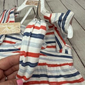Adorable striped dress with matching navy shorts. Includes a cute headband. Perfect for a stylish look.