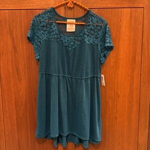Nice dark teal color top with lace accents, elastic waist with stretch. Juniors XXL, great for stocking stuffer, bundle for discount.