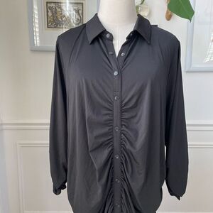 New tags, torrid, long sleeve snap front midi length dress that is shirred down the front and the back center for a flattering silhouette made of a stretchy jersey polyester and spandex blend material. Laying flat measures 43 inches shoulder to him, 24 inches armpit to armpit and 22 inches straight across the waist. Fabric has a fair amount of stretch. Tag size 3, which towards sizing is roughly equivalent to a size 3X please double check measurements to ensure the proper fit for you $70 retail.