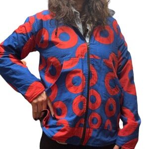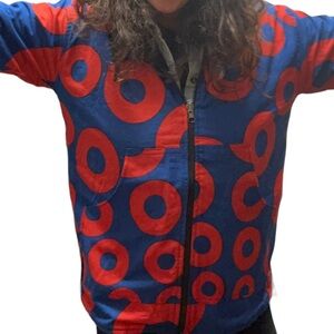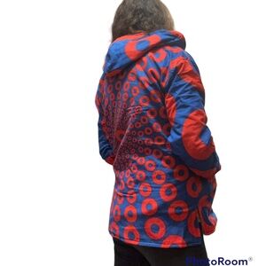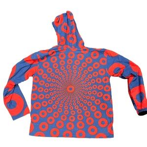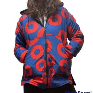 Unisex hooded zip front jacket in Fishman Donut pattern. Fun prints, kangaroo outer pocket, zip front with drawstring hood. Fleece lined with a secret inside pocket! Measurements in photos are taken from a small.