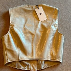Brand new with no flaws. This is a gorgeous vegan, leather square neckline crop top with polyester lining and large front button closures with an extra button set just in case. There is no boning, but there is stitching that would imply a corset type silhouette and the vegan leather seems to be patent, making it extra shiny and almost metallic.