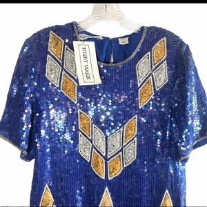 New with tags vintage size Medium Night Vogue 100% hand made, silk, sequined and beaded top. Round neck, short sleeves. 2-3” side slits. 100% silk with polyester lining. Single button at back neckline with small keyhole opening. Some minor imperfections, it is vintage. Beading, sequins, and everything in excellent condition overall. Very ornate and light catching. Tiny beaded collar, sleeve, and hem accents. Deep blue sequins over entire front and back with gold and silver designs.