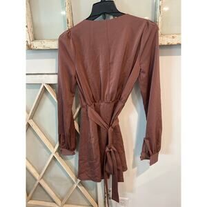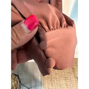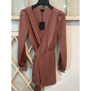 New with tags (small flaw) NBD size XS pink satin wrap dress. I have shown a close up of the flaw. On one sleeve the button loops are not attached and can be easily fixed. Measures 18 1/2” from armpit to armpit. 1:” across the waist and it is 31” long.