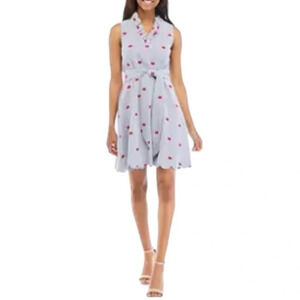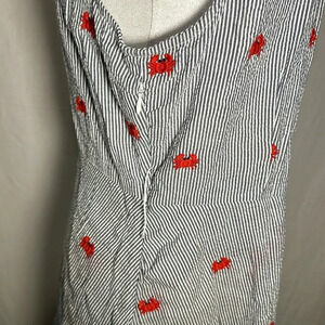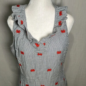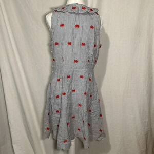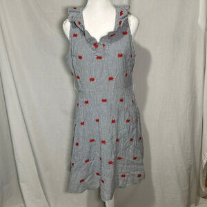 NWT women's embroidered crab print striped Crown & Ivy dress size medium - tag describes as blue crab Americana. Ruffle neckline, scalloped hem, side zip. No belt