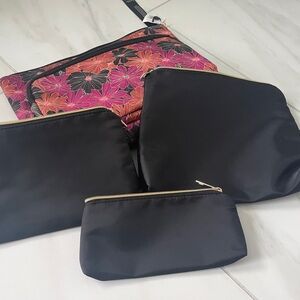 This set includes 4 bags. The large floral bag has a zipper pocket in the front. The other three bags are black with a zipper close. All are made of a waterproof material.