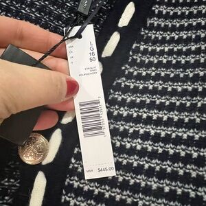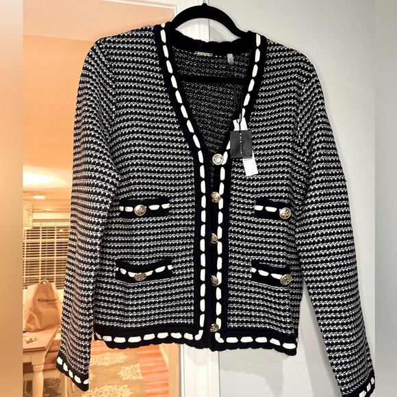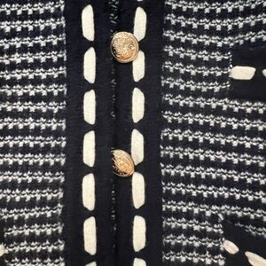 Soft cozy navy/ white cardigan sweater. Wool & cashmere blend. Sz L. 22 in shoulder to hem, 21 in across back. Gold buttons on sleeves