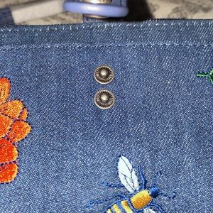 Beautiful denim designed with embroidered flower leaf and a B on the front to double snap for the outside slip pocket. The inside has two sections each section has eight card slots, two slip slots in between both sections as a zipper part with the super zippy, and there is an additional strap for Crossbody.