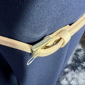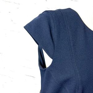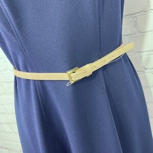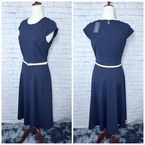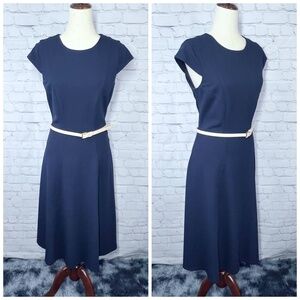 Brand new with tags. A pretty navy sheath dress with a touch of fit and flare. Cap sleeves. Tan belted. Size 10. Approximate measurements in inches when laid flat: shoulders 14 across, chest 17.5 across pit to pit, waist 15.5 across, full length 45. 1 lb. 5 oz.