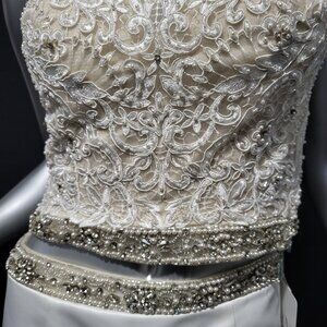 NWT~$1095~MON CHERI~SZ 6~IVORY TWO PIECE EMBELLISHED CROP TOP WEDDING DRESS~STUNNING LACE EMBROIDERED CORSET CROP TOP. EMBELLISHED WITH PEARLS & RHINESTONES. MATCHING EMBELLISHED WAIST MERMAID STYLE SKIRT. BACK ZIPPER FOR CLOSURE. SIZE 8. HOWEVER I BELIEVE THIS FITS MORE LIKE A SIZE 6. THE MANNEQUIN IS A SIZE 4 AND IT ALMOST FITS HER. THE TOP SEEMS TO RUNS SMALL. THE CHEST MEASURES 34". THE BOTTOM BAND OF THE TOP MEASURES 27" AROUND. THE WAIST OF THE SKIRT MEASURES 29". ONE MAY HAVE TO ALTER ONE OR THE OTHER TO FIT. NEW HOWEVER I DID NOTICE A FEW MISSING OR LOOSE EMBELLISHMENTS. VERY HARD TO EVEN FIND. ALSO THERE IS ONE TINY WATER LIKE SPOT AT THE BOTTOM OF THE SKIRT. SEE PHOTO. ONE WOULD HARDLY NOTICE. SELLING AS-IS BECAUSE OF THIS. IT IS GORGEOUS IN PERSON. SEE MON CHERI SIZE CHART POSTED FOR ADDITIONAL MEASUREMENTS. LISTING AS A SIZE 6 INSTEAD OF A SIZE 8.