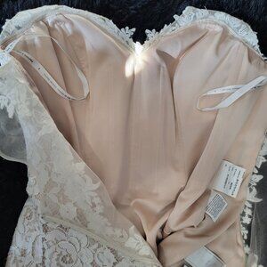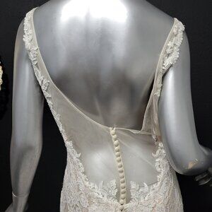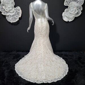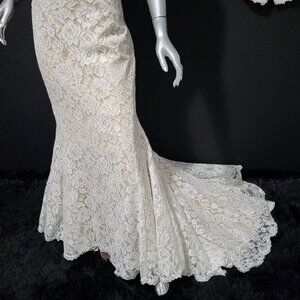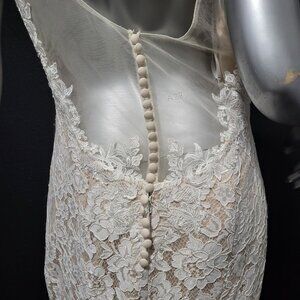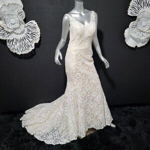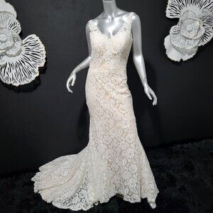 NWT~$1450~ELLA ROSA~10/12~IVORY NUDE FLORAL LACE FIT & FLARE WEDDING DRESS GOWN~SOFT OFF WHITE LACE WITH ALMOND NUDE COLORED LINING. LIGHTLY PADDED CORSET BUST. STUNNING SHEER BUTTON ZIPPER BACK. SCALLOPED TRAIN. SIZED A 14. HOWEVER IT DOES RUN SMALL. IT FITS MORE LIKE A SIZE 10 TO 12. SEE ELLA ROSA SIZE CHART POSTED FOR MEASUREMENTS. GORGEOUS IN PERSON.