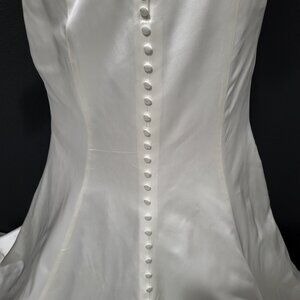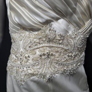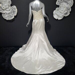 NWT~$1850~CB COUTURE~6/8~IVORY STRAPLESS MERMAID FIT & FLARE WEDDING DRESS~EMBELLISHED WITH SEQUINS, BEADS, AND RHINESTONES. RUCHED CORSET BUST. BACK ZIPPER AND BUTTONS FOR CLOSURE. BUTTONS GO ALL THE WAY DOWN TO THE BOTTOM OF THE TRAIN. SIZED A 10 HOWEVER RUNS A BIT SMALLER. FITS MORE LIKE A SIZE 6 TO 8. SEE SIZE CHART POSTED FOR MEASUREMENTS. I DID NOTICE A COUPLE OF LOOSE STRINGS. THERE MAY BE A FEW MISSING EMBELLISHMENTS. HOWEVER ITS VERY HARD TO TELL. ALSO THERE ARE A FEW SMALL MINOR MARKS AT THE BOTTOM OF THE DRESS. ONE WOULD NEVER NOTICE. STUNNING IN PERSON.