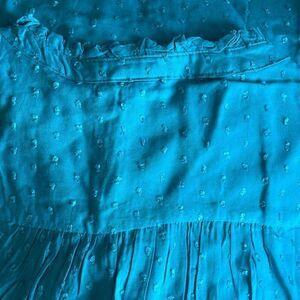 Brighten your wardrobe with this Torrid sleeveless blouse in a vibrant turquoise hue. Featuring an allover textured Swiss dot pattern, a delicate ruffle-trim neckline, and fabric-covered front buttons, this top offers a perfect blend of playful texture and polished style. The flowy rayon fabric drapes beautifully, while the lightweight feel makes it ideal for layering or wearing alone in warmer weather.