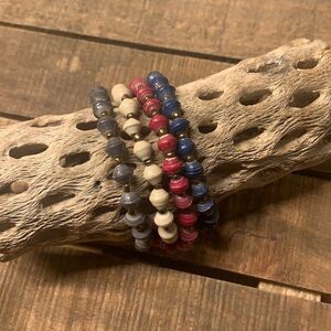 NWT Set of 4 pretty Daphne bracelets by 31 Bits. Wear them as a set, in smaller sets of two, or individually. One navy, one wine, one cream and one dark grey. Hand crafted by Ugandan refugee artisans in return for a fair living wage. Made with an elastic backing to accommodate various wrist sizes.
