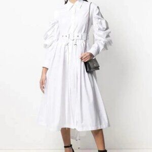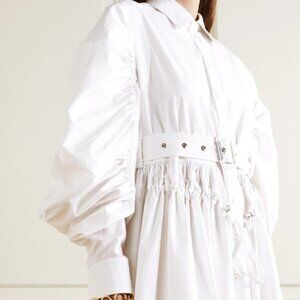 This oversized crisp cotton dress has softly structured puff sleeves and a nipped-in waist, an adjustable buckle belt, and drawstrings at the waist and vented hem. There is so many beautiful details in this designer dress!!