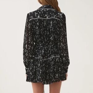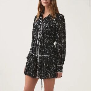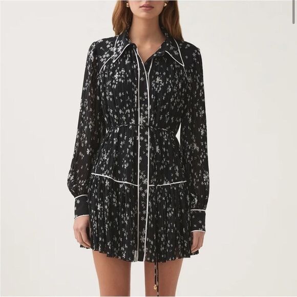 The perfect mini dress for those warmer months.Elevate your wardrobe with the Starflower Mini Dress by Aje., a stunning piece in the Nightfall Daisies pattern. This women's dress features long sleeves and a shirt silhouette, crafted from 100% recycled polyester for a sustainable style choice. The design includes a pleated texture, contrast piping, and a removable self-tie belt, all complemented by a shirt collar and front button closure. Care for this dress by dry cleaning it to maintain its impeccable look.
