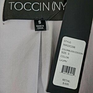 NWT~$695~TOCCIN~SZ S~STUNNING PURPLE BLACK BELTED COLORBLOCK TRENCH COAT JACKET~GORGEOUS COLORS. OPEN FRONT WITH BELT FOR CLOSURE. SLIT POCKETS. VENTED BACK. SLEEVES MEASURE 23 3/4" FROM THE SHOULDER DOWN. SHOULDERS MEASURE 16 1/2" ACROSS. CHEST MEASURES 18" UNDERARM TO UNDERARM. DEPENDING ON HOW TIGHT ONE WRAPS IT. TOTAL LENGTH TOP TO BOTTOM DOWN THE BACK MEASURES 39". NEW HOWEVER THE STRING BELT LOOPS ARE A BIT LOOSE. STUNNING ON.