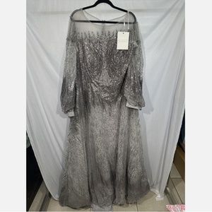NWT$798 Mac Duggal [ 24 ] Jewel Encrusted Illusion Long Sleeve A-Line Gown Silve