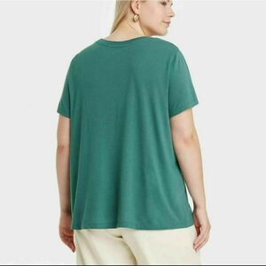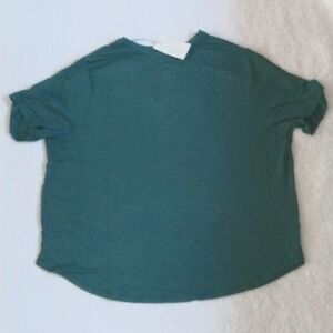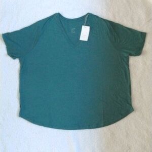 This women's short-sleeve T-shirt is tailored in a relaxed / loose fit. It has a V-neckline and curved hem for feminine flair. The pullover tee is made from soft and drapey fabric with a hint of spandex for flexible wear that adjusts and moves with you. In a solid hue, this top makes a versatile addition to your closet, and it pairs effortlessly with any style of bottoms for a range of dressy and casual outfits.