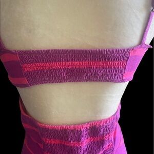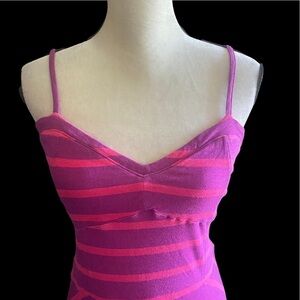 beautiful purple and pink striped dress, elastic back, adjustable straps, stretchy material, full skirt, excellent condition, never been worn, size xl