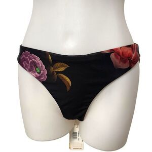 Chic reversible low rise Brazilian cut bottom bikini bottom with a coral and black floral pattern. Ideal for sunny beach outings.