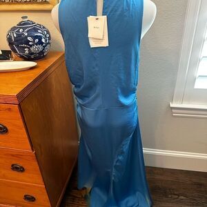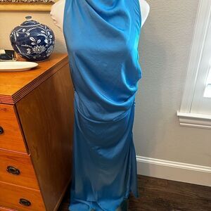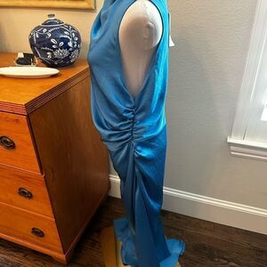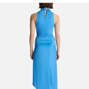 Crafted from luxurious stretch satin fabric in a striking bright blue hue, this dress is designed to make a statement. The Iggy dress features a delicately draped mock neck and ruched detailing, adding an elegant touch to the body-skimming silhouette. The asymmetrical skirt adds an element of modernity and adds movement to your stride.