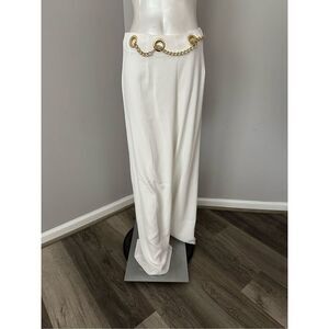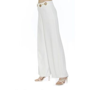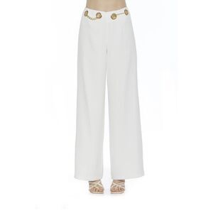 Add a touch of luxury to your wardrobe with the Cassie Pants. These sophisticated mid-rise pants feature a gold rope chain detail and grommet on the waist, adding a glamorous touch to any outfit. With their wide leg design, these pants will elevate your style and make you feel like a fashion icon.