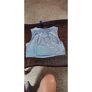NEW WITH TAGS ALLEGRA K SHINY METALLIC BLUE CROP TOP STRETCHY MATERIAL POMS SIZE LARGE