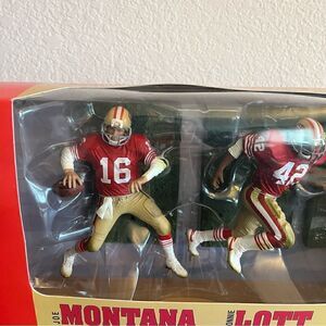 NWT. YOUR OPPORTUNITY TO OWN THREE OF THE GREAT 49ERS IN MODERN NFL HISTORY: JOE MONTANA, RONNIE LOTT & JERRY RICE. PACKAGE SHOWCASES ALL THREE LEGENDS IN THEIR COOL RED/GOLD UNIFORMS. FIGURES ARE IN GREAT SHAPE AND THE BOX IS IN EXCELLENT CONDITION.