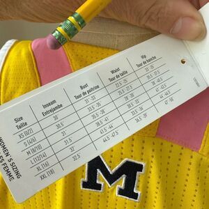 New tags, Adidas women’s University of Michigan appliqué pink out basketball jersey with notched hip for easy movement. Pink trim at the neck and down the sides with the iconic maze and blue balance. Laying flat measures 32 inches shoulder to him and 22 inches armpit to armpit. The size is XL +2, which indicates an additional 2 inches for tall sizing.