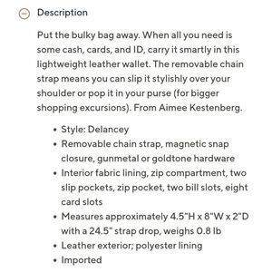 • Put the bulky bag away. When all you need is some cash, cards, and ID, carry it smartly in this lightweight leather wallet. The removable chain strap means you can slip it stylishly over your shoulder or pop it in your purse (for bigger shopping excursions). From Aimee Kestenberg.