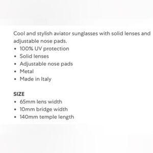New. Cool and stylish aviator sunglasses with solid lenses and adjustable nose pads. 100% UV protection Solid lenses Adjustable nose pads Metal Made in Italy SIZE 65mm lens width 10mm bridge width 140mm temple length #mobwife 🌺