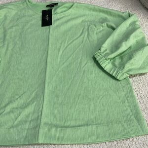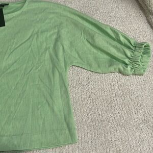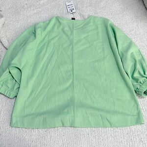 Light neon green textured print stretchy fabric, oversized stretchy comfy top, 3/4 sleeves with elastic cuffs, front & back middle seam design