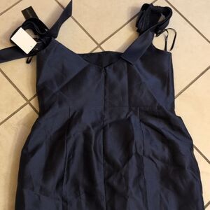 New with tag Alfred Sung style D868 Satin Fit and Flare Maxi Dress / Gown with Shoulder Bows in Midnight Navy. Retail: $269