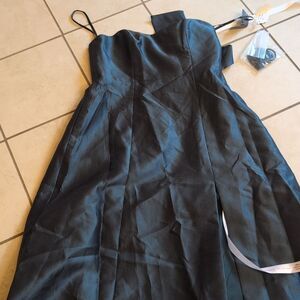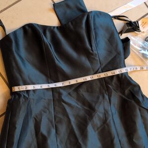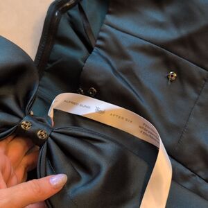 New with tag Alfred Sung style D842 Strapless A-line Satin Gown with Modern Bow Detail in Evergreen. Size 14 please see measurements pictures to be sure of fit. Retail: $282